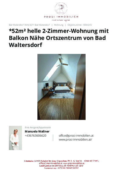 Die Wohnung befindet sich in ruhiger Lage, fußläufig zu Nahversorgern, Kindergarten, Schule, Therme und öffentlichen Verkehrsmitteln.