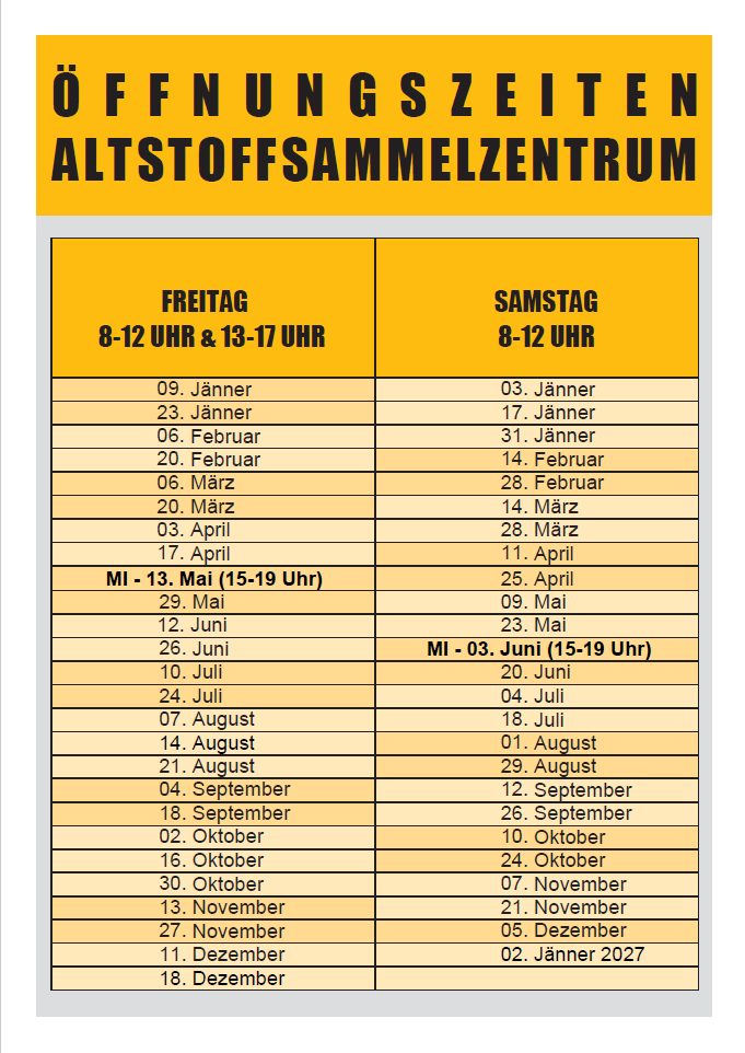 Die Öffnungszeiten des ASZ entnehmen Sie diesem Plan: Öffnungszeiten 2026