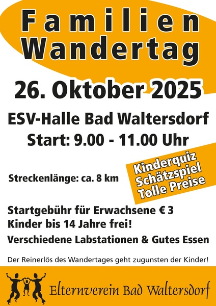 Am 26. Oktober 2025 lädt der Elternverein Bad Waltersdorf alle Wanderfreunde zum gemeinsamen Familienwandertag ein. Start ist zwischen 9:00 und 11:00 Uhr bei der ESV-Halle Bad Waltersdorf.